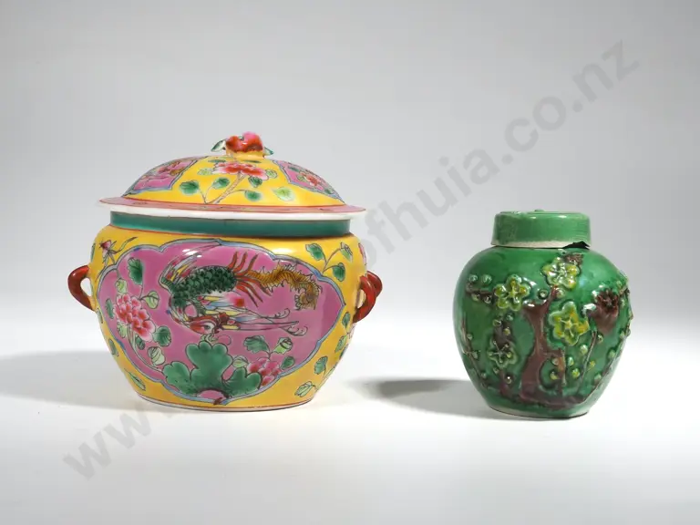 Pair of Oriental Lidded Jars: One Famille Rose & One Embossed Jade Glaze Estimate: $40 - $60