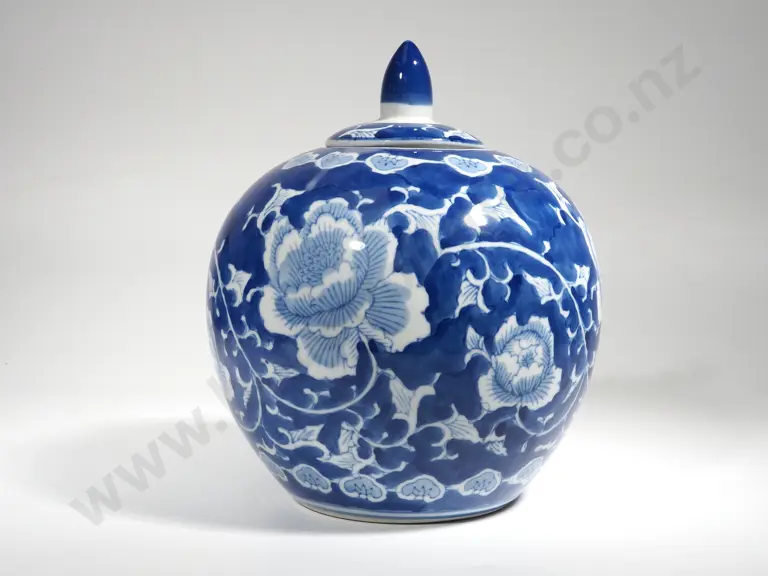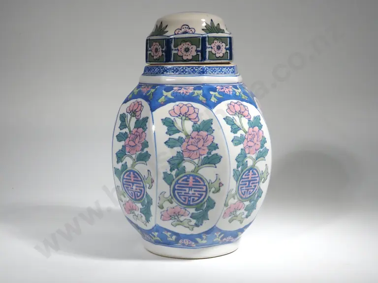 Large Blue & White Ginger Jar with PInk & Green Accents Estimate: $40 - $60