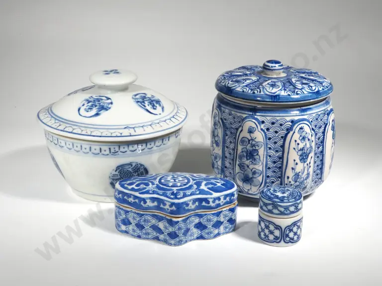 Four Pieces of Blue & White China Covered Jars Estimate: $50 - $80