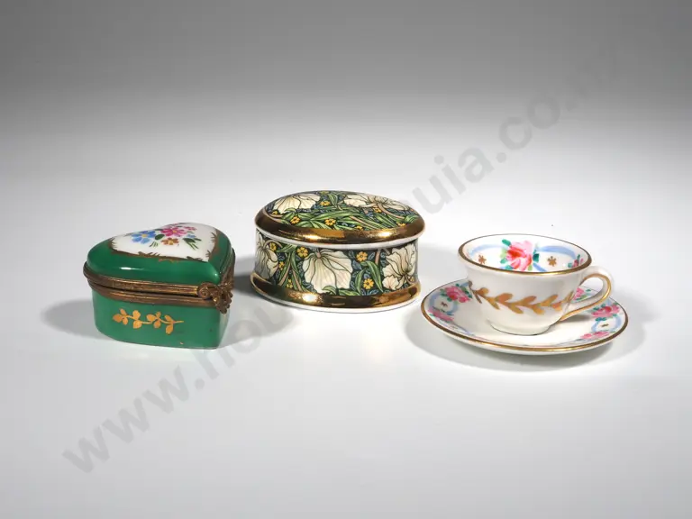 Heart Shaped LImoges Ring Box, William Morris " Pimpernel" Oval Ring Box & A Miniature Foley Cup & Saucer