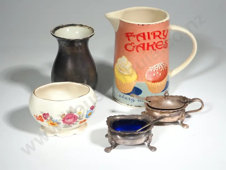 "Fairy Cakes Jug" EPNS Salt & Mustard Pot With Spoons, Small Lustre Vase & A Lancaster Trough Vase