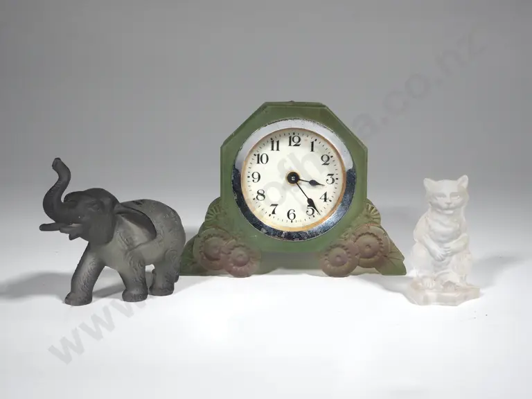 Vintage Small Green Glass Mantle Clock & A Glass Elegant & Cat