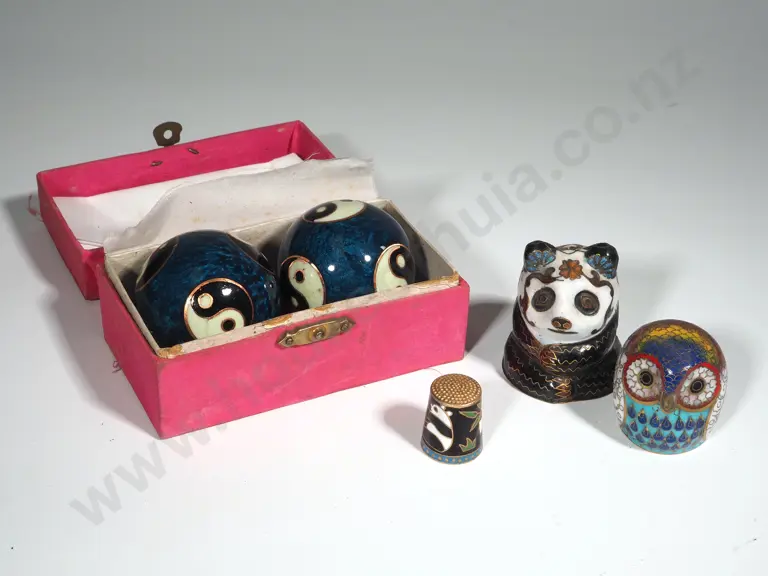 Boxed Cloisonné Baoding Balls, Cloisonné Panda and Owl & A Cloisonné Thimble