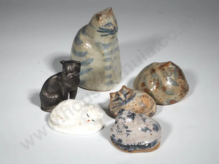 Four Pottery Blue & White Cats, A White Porcelain Cat & A Pewter Cat