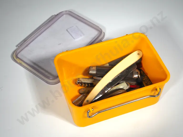 Box Containing Cut Throat Razors & Vintage Pocket Knives