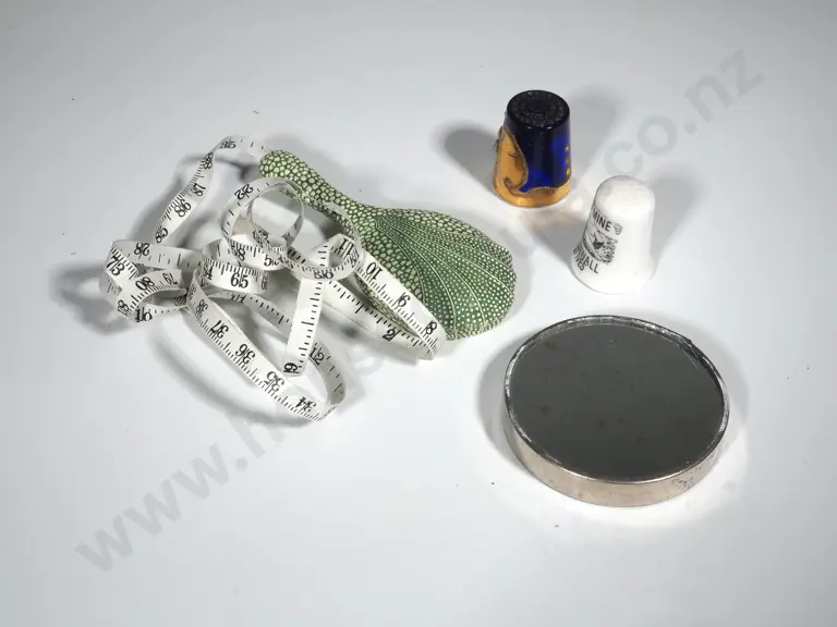 A Tape Measure In The Form Of A Minature Hand Mirror (Not Retracting), Two Thimbles (One Venetian) & a Vintage Game