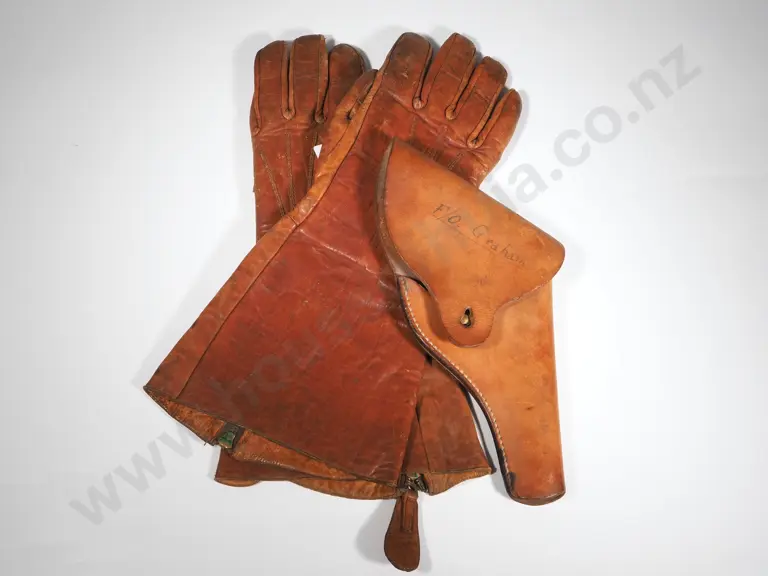 WW2 Leather Flying Gauntlets & Period Leather Holster Named to Flying Officer Graham - Pilot in the Pacific