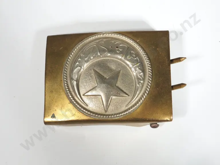 WW1 German Belt Buckle in Brass with Shrapnel Damage & Cloth Portapee