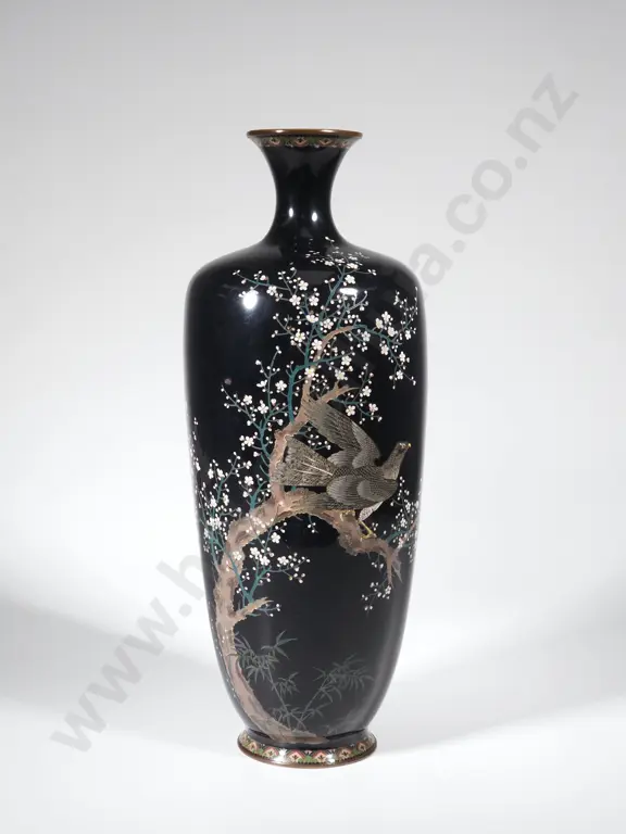 A Fine Cloisonne Meiji Period Vase Featuring Floral & Bird Motifs Against A Black Ground. Late 19th Century Japanese. Estimate: $200 - $300