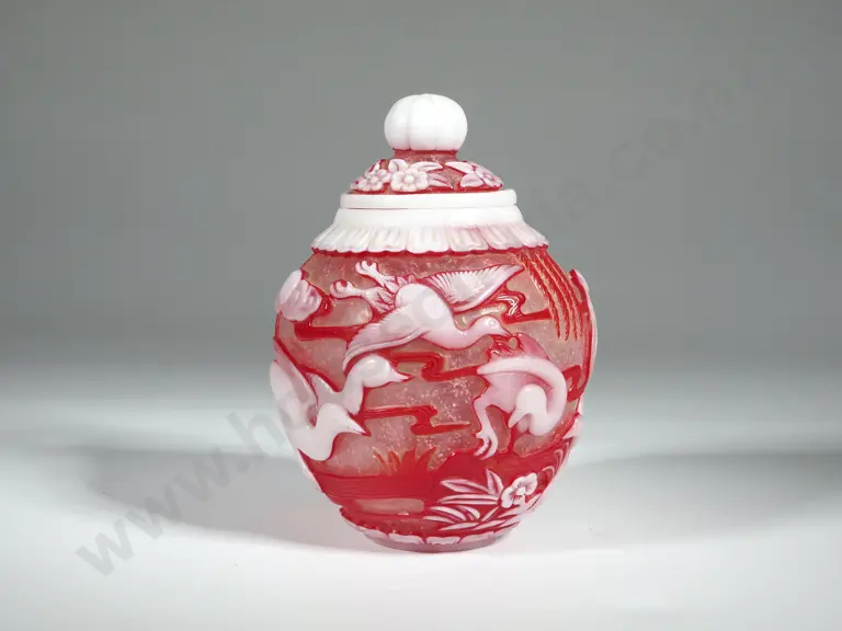 Oriental Red Glass Ginger Jar w Bird Motifs - Lid A/F Estimate: $100 - $200