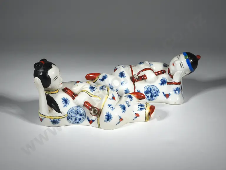 Pair Of Chinese Doucai Porcelain Figures of A Reclining Male & Female Smoking Opium PIpes. Estimate: $100 - $200