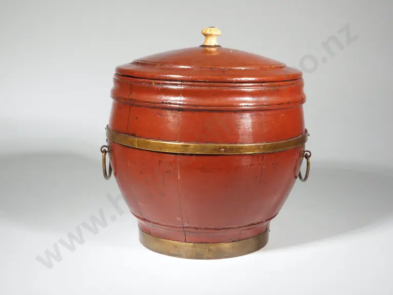 Chinese Red, Lidded, Lacquered, Wooden Barrel w Brass Bands & Handles,and Ceramic Lid Finial