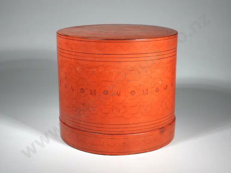 Finely Detailed Cylindrical Red Lacquered Four Piece Container. Estimate: $80 - $140