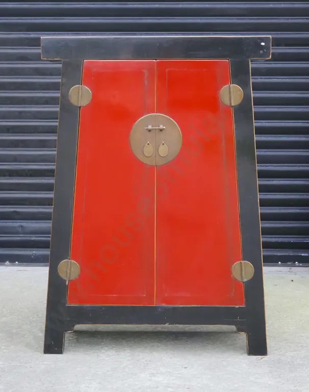Chinese Red & Black Lacquered Wedding Cabinet Of Tapered Form