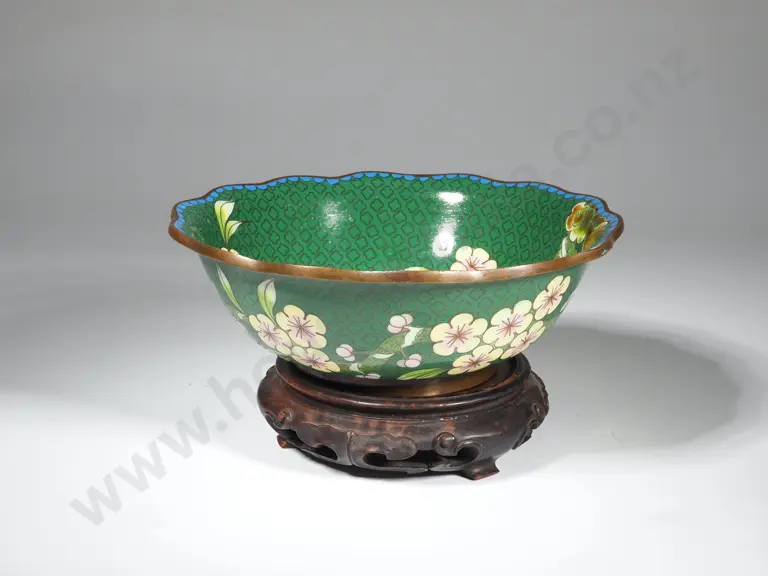 Vintage Green Cloisonne Bowl With Scalloped Edge & Apple Blossom Decoration Estimate: $50 - $100