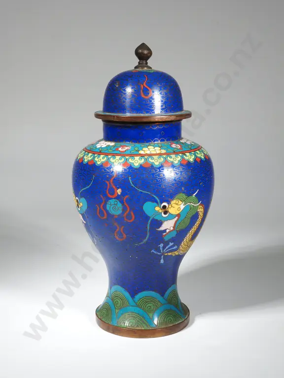 Vintage Blue Ground Cloisonne Lidded Vase Decorated w Yellow Dragons Estimate: $100 - $200