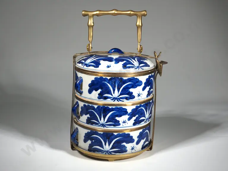 Antique Three Tier Blue & White Porcelain Chinese Tiffin with Brass Straps & Handle