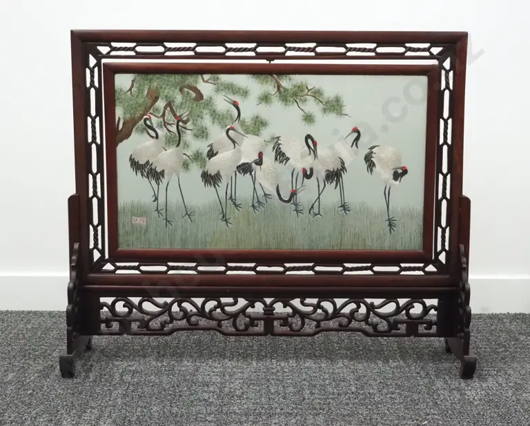 Vintage Chinese Double Sided Silk Screen Depicting Nine Auspicious Cranes In An Ornate Carved Wooden Frame On Stand Estimate: $250 - $500