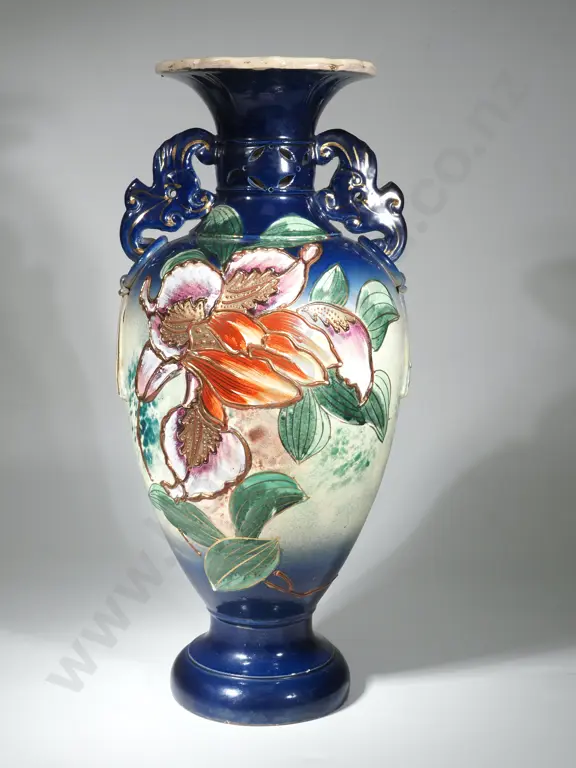 Large Antique Japanese Satsuma Vase with Blue Rim & Foot. The Body Of the Vase w Moulded Floral Decoration Estimate: $100 - $200