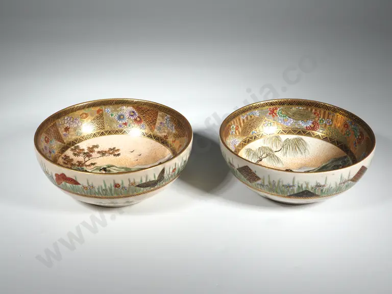 Two Intricate Satsuma Bowls Hand-painted By Shuzan.. Interior Scenes Of Figures In a Landscape