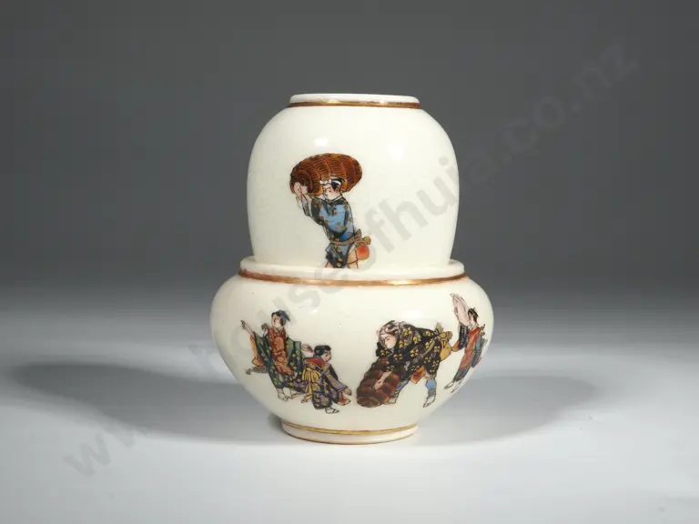 Japanese Finely Painted Satsuma Miniature Vase on Cream Crackle Glaze Ground w Gold Trim.