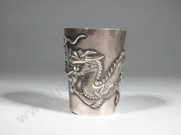 Antique Chinese Sterling Silver Beaker. Heavily Embossed With Dragons. Estimate: $150 - $250