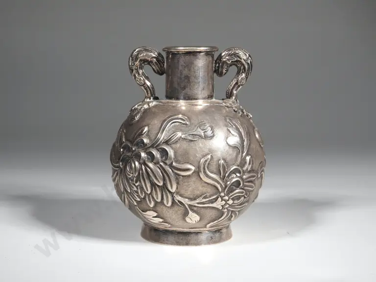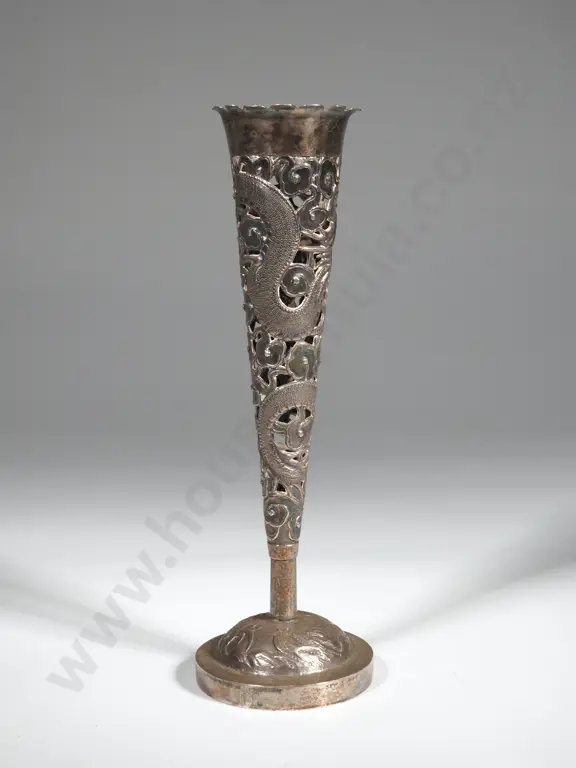 Antique Chinese Export Silver Pierced Trumpet Vase by Wang Hing, Dragon Soaring Amongst Clouds Estimate: $100 - $200