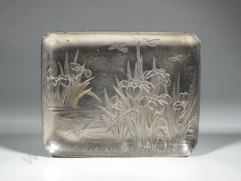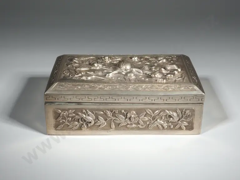 Embossed Chinese Export Silver Box With Flowers, Birds & Fish