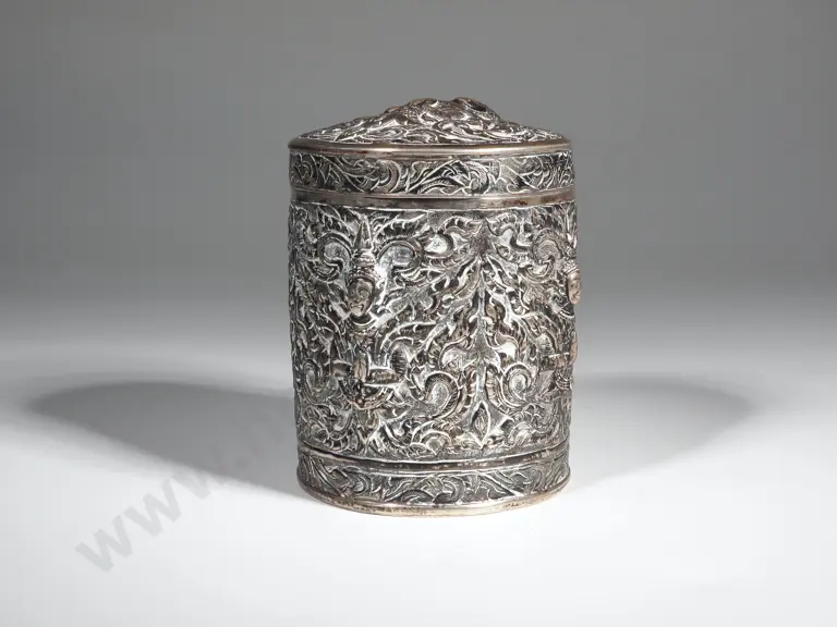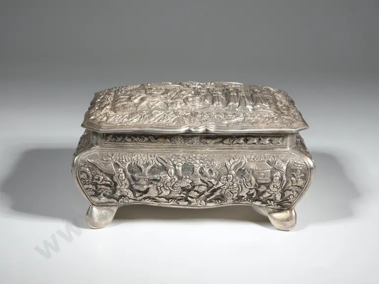 Chinese Export Silver Bombe Shaped Box, Village Scene Top With Mounted Warriors Around The Base. Signed Underneath Estimate: $750 - $1,000