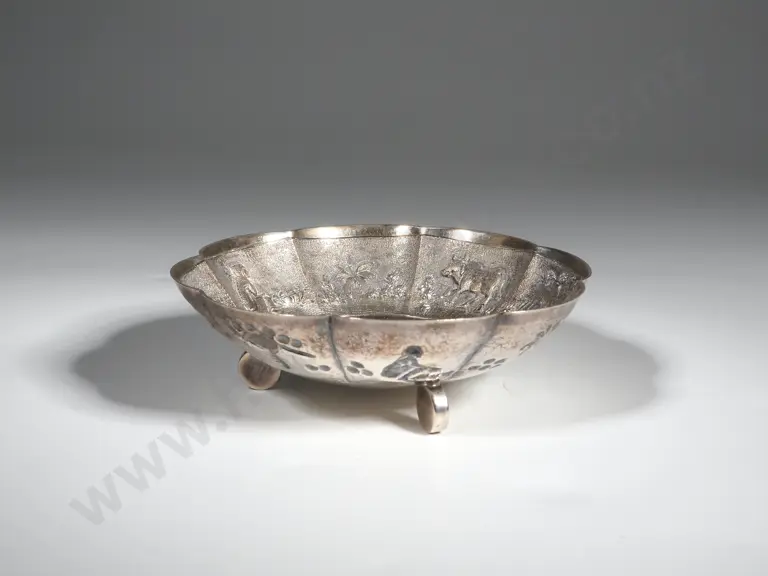 Sterling Silver Footed Bowl w Oriental Farming Scenes