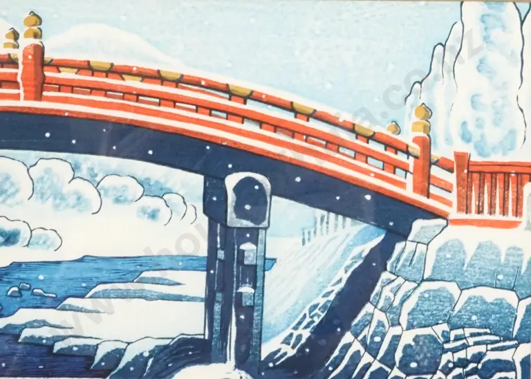 Okuyama Gihachiro (1907-1981) New Snow At The Sacred Bridge In Nikko, Woodblock Print Estimate: $100 - $200