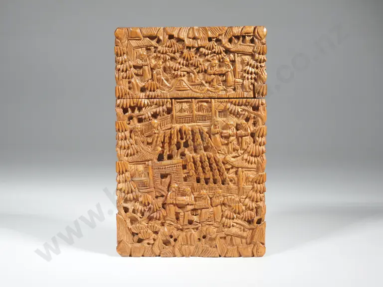 Chinese Sandalwood Business Card Case, Late 19th Century. Heavily Carved W Figures, Building & Foliage Estimate: $300 - $600