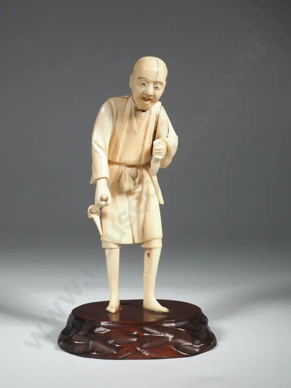 Antique Chinese Okimono of a Fisherman On A Wooden Stand With Fish in One Hand & Filleting Tool in The Other