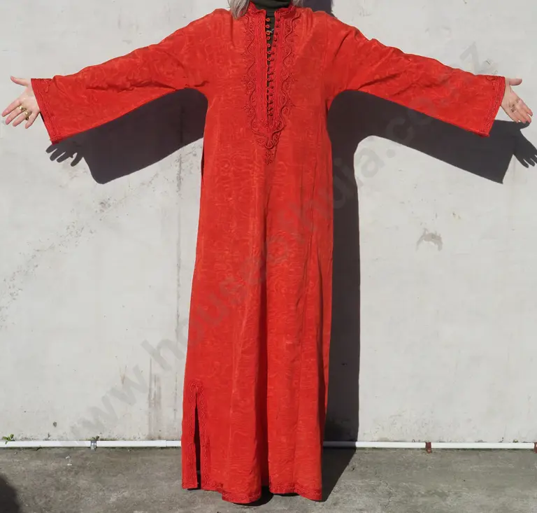 Vintage Moire Silk Kaftan with Elaborate Over Embroidery & Braiding. Handmade Loop & Button Closure in Vermilion Estimate: $100 - $200