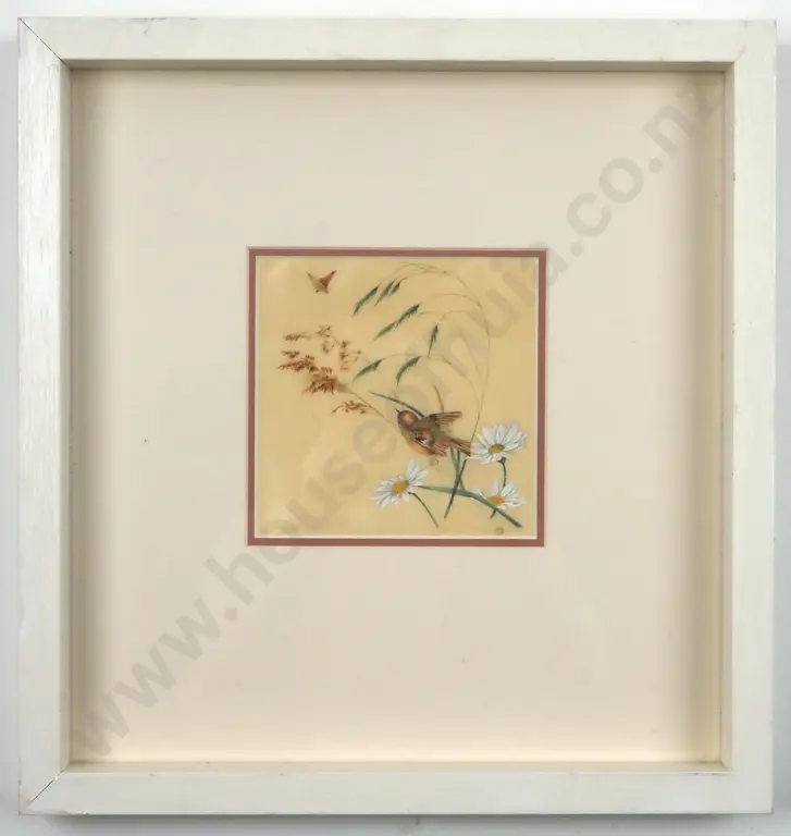 T.G. Bird at Play w Daisies. Watercolour on Silk.