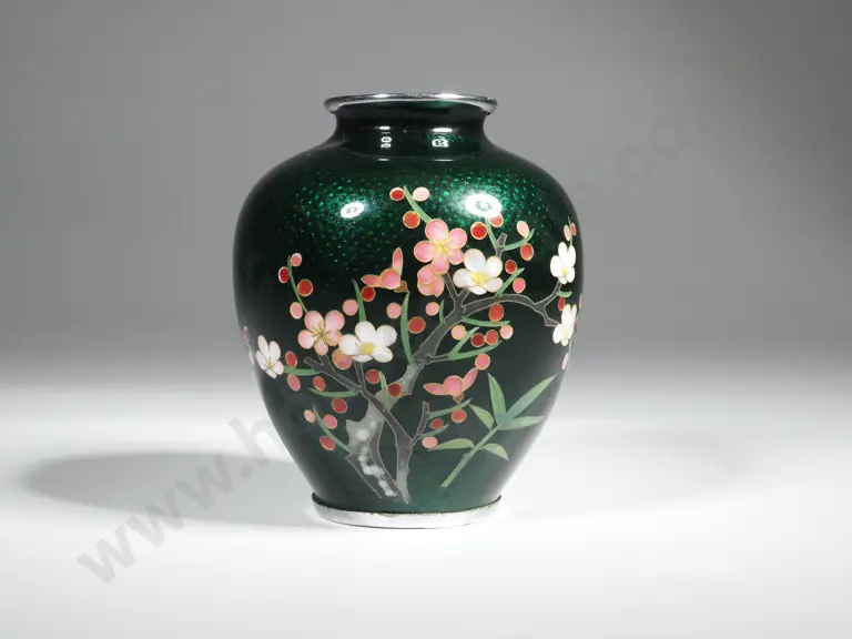 Vintage Japanese Green Cloisonné Vase with Floral Decoration & Silver Trim Estimate: $50 - $100