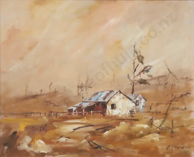 MCKenzie. 1962. Old Shearing Shed, Bannockburn, Central Otago. Oil on Board.