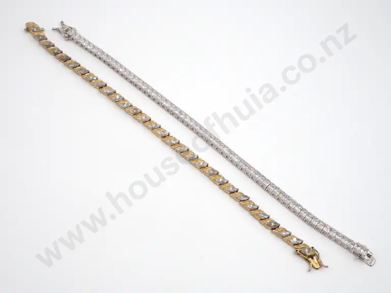 A Silver & White Stone Tennis Bracelet & Gold Plate On Silver Fancy Link Bracelet With White Stones