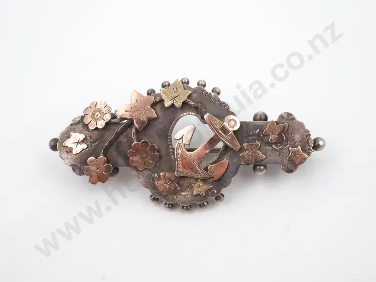 Antique Sterling Silver & Gold Brooch. The Gold in Two Tones Depicting Leaves & Anchor Symbolising Stability & Renewal Estimate: $50 - $100