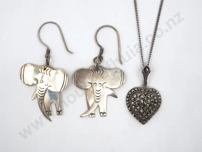 Sterling Silver Sterling Silver & Marcasite Heart Shaped Pendant & Elephant Drop Earrings Estimate: $40 - $80