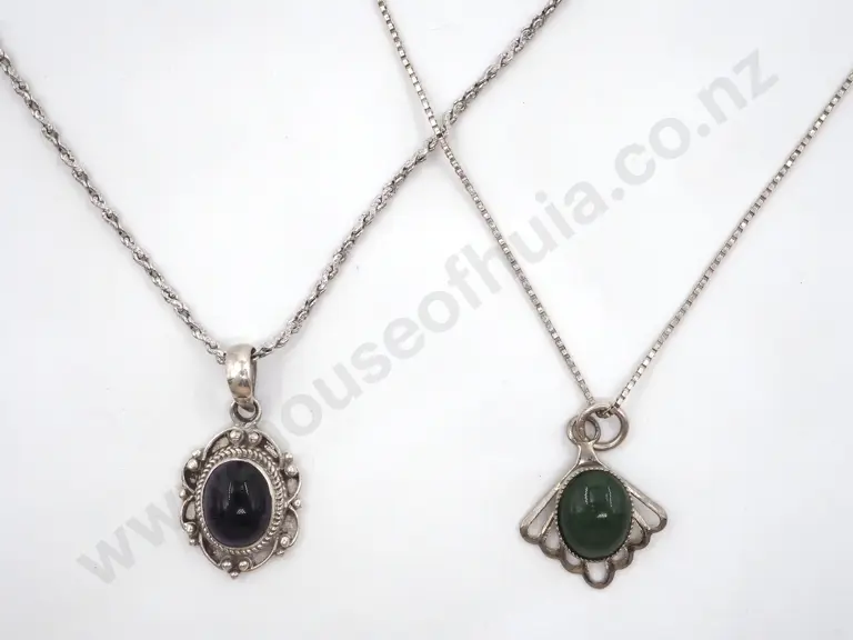 Sterling Silver Greenstone Pendant On Box Link Chain & An Amethyst Cabochon Pendant On a Rope Twist Chain Estimate: $50 - $100