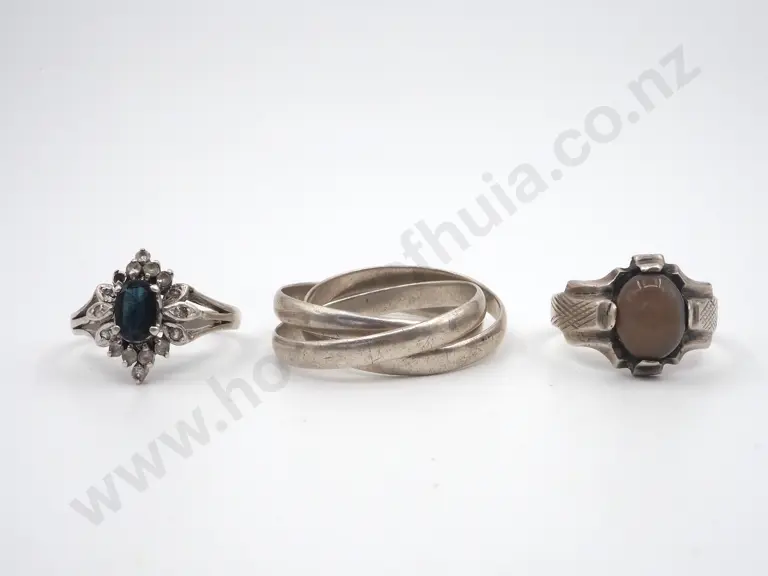 Three Sterling Silver Rings. A Russian Wedding Ring, Blue & White Stone Dress Ring & An Oval Stone Ring Estimate: $40 - $80
