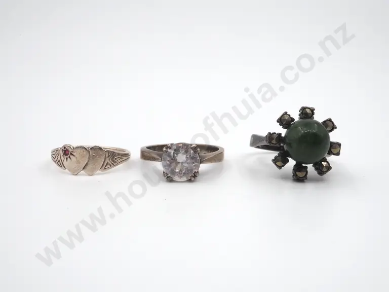 Three Sterling Silver Rings, One a Signature Ring, Greenstone Ring & a Solitaire Estimate: $50 - $100