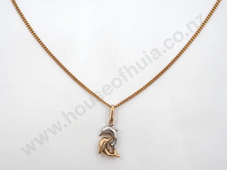 9ct Gold Chain & Pendant. The Pendant Depicting Two Intertwined Dolphins in White & Yellow Gold & Inset with a Diamond Estimate: $100 - $200