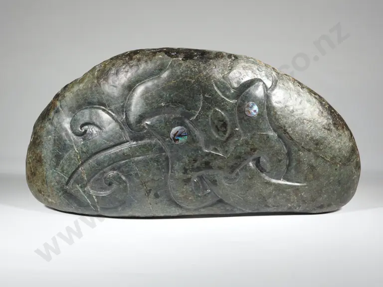 Large Greenstone Bolder Carved with a Tiki & Set W Paua Shell Eyes. Estimate: $1,000 - $1,500