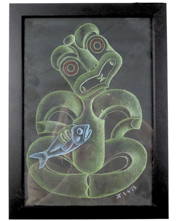 Tahu Jacomb,"Tiki With Fish ". Pastel On Black Paper. Dated 05.04.23. 280 x 200mm Estimate: $300 - $500