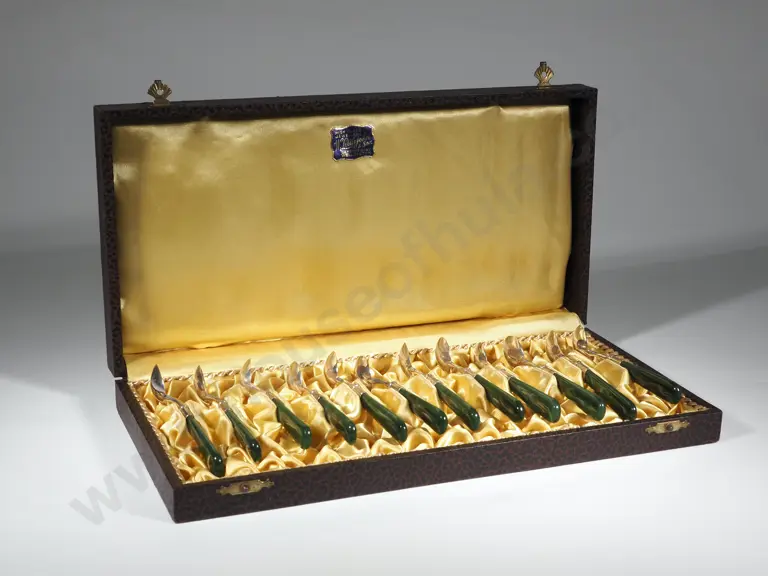 Cased set of 12 teaspoons in S/S and Greenstone by W Littlejohn and Sons Estimate: $750 - $1,000