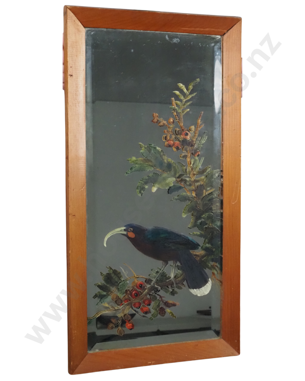 Timber Framed Mirror with Handpainted Scene Of A Huia In a Bush Estimate: $250 - $500