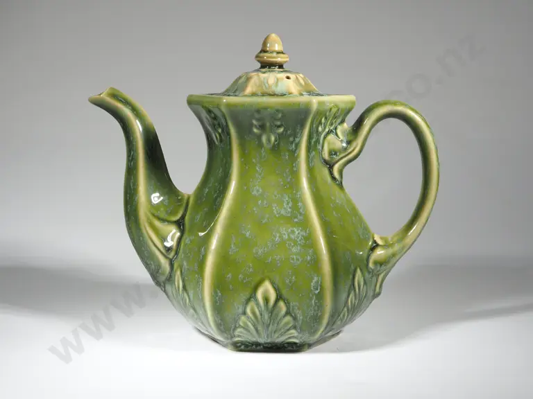 Hexagonal Temuka Coffee Pot with Celadon/ Mauve Glaze & Applied Moulded Decoration Estimate: $350 - $550