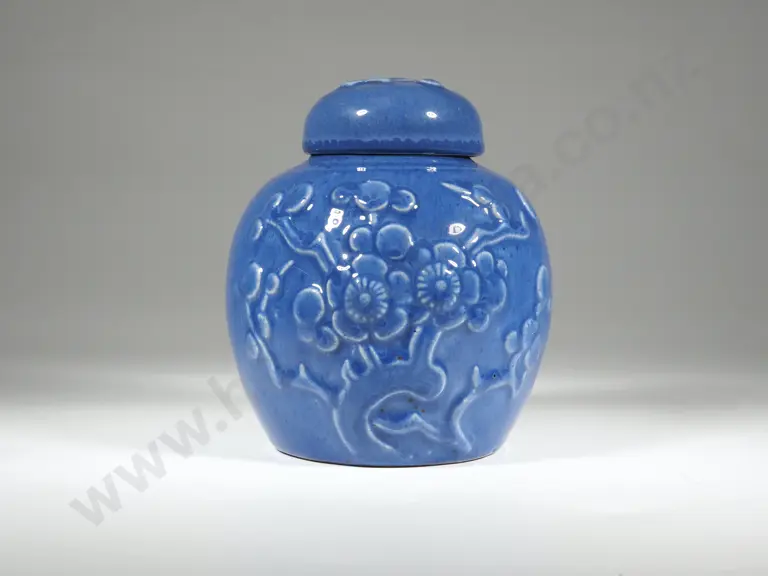 Crown Lynn Sky Blue Ginger Jar w Moulded Apple Blossom Decoration Estimate: $100 - $200